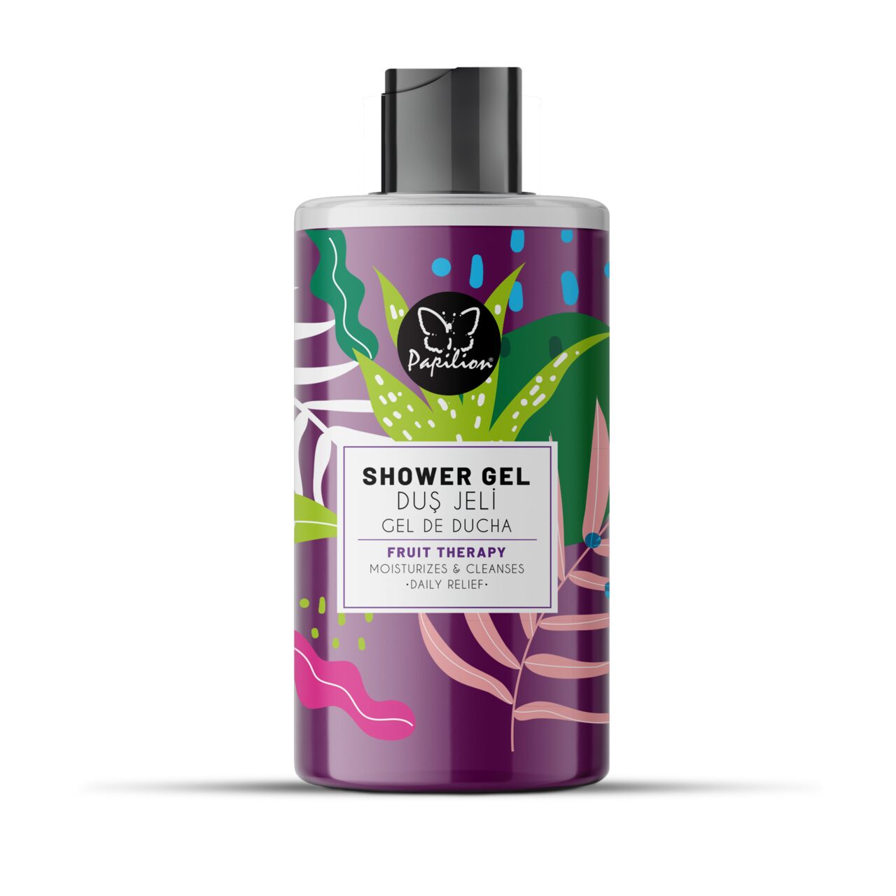 Gelul de dus Papilion Fruit Therapy with Wild Blueberry din noua gama de geluri de dus cu arome moderne si revigorante curata si catifeleaza pielea, prevenind uscarea acesteia.