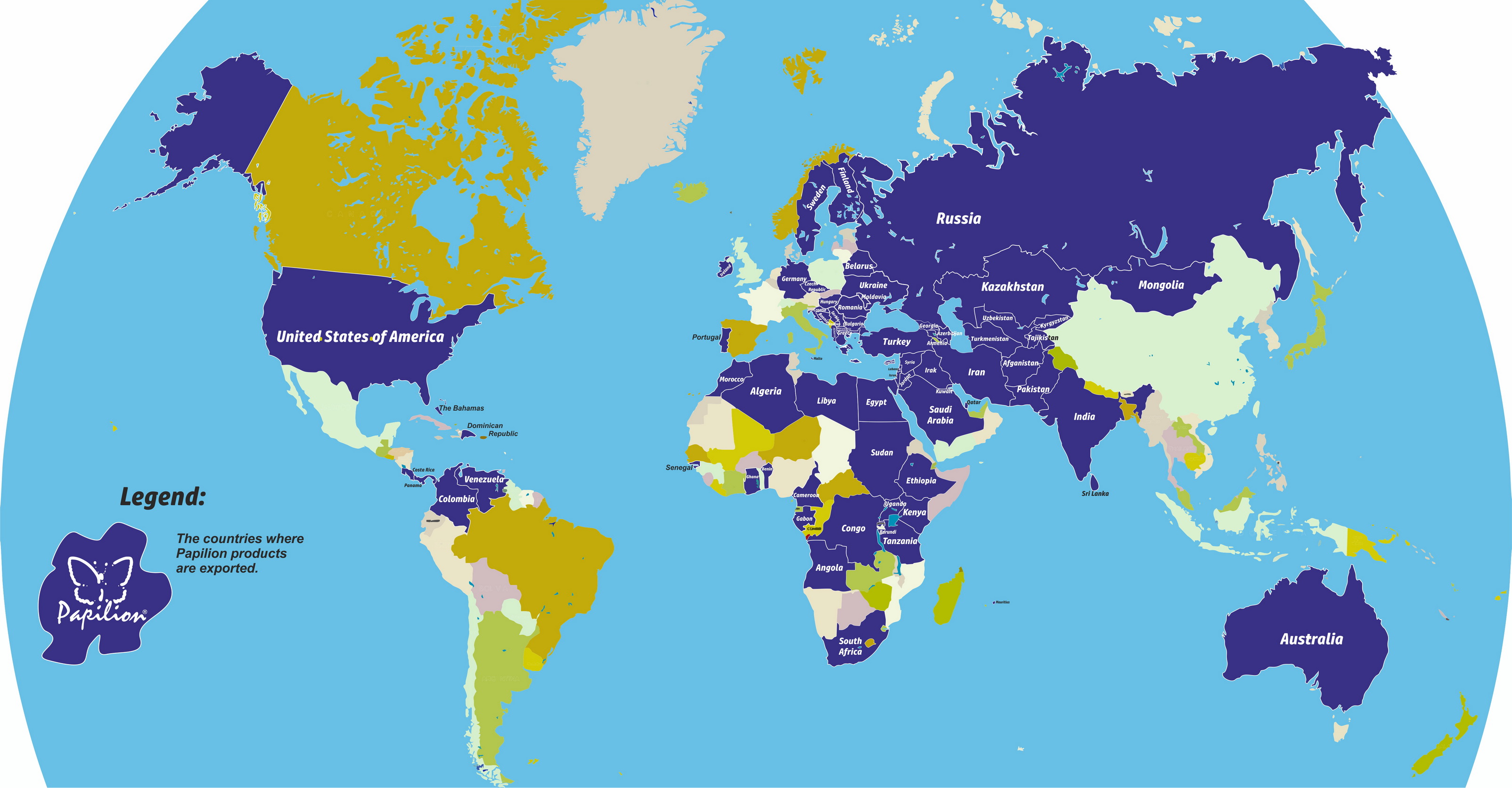 Gama de produse inregistrate sub brandul Papilion® sunt prezente in peste 75 de tari cum ar fi Romania, Ungharia, Grecia, Etopia, Egipt, Panama, USA, Turkmenistan, Azerbadjan, Bahama etc. In cel putin 40 de tari marca Papilion® este inregistrata ca brand apartinand producatorului.